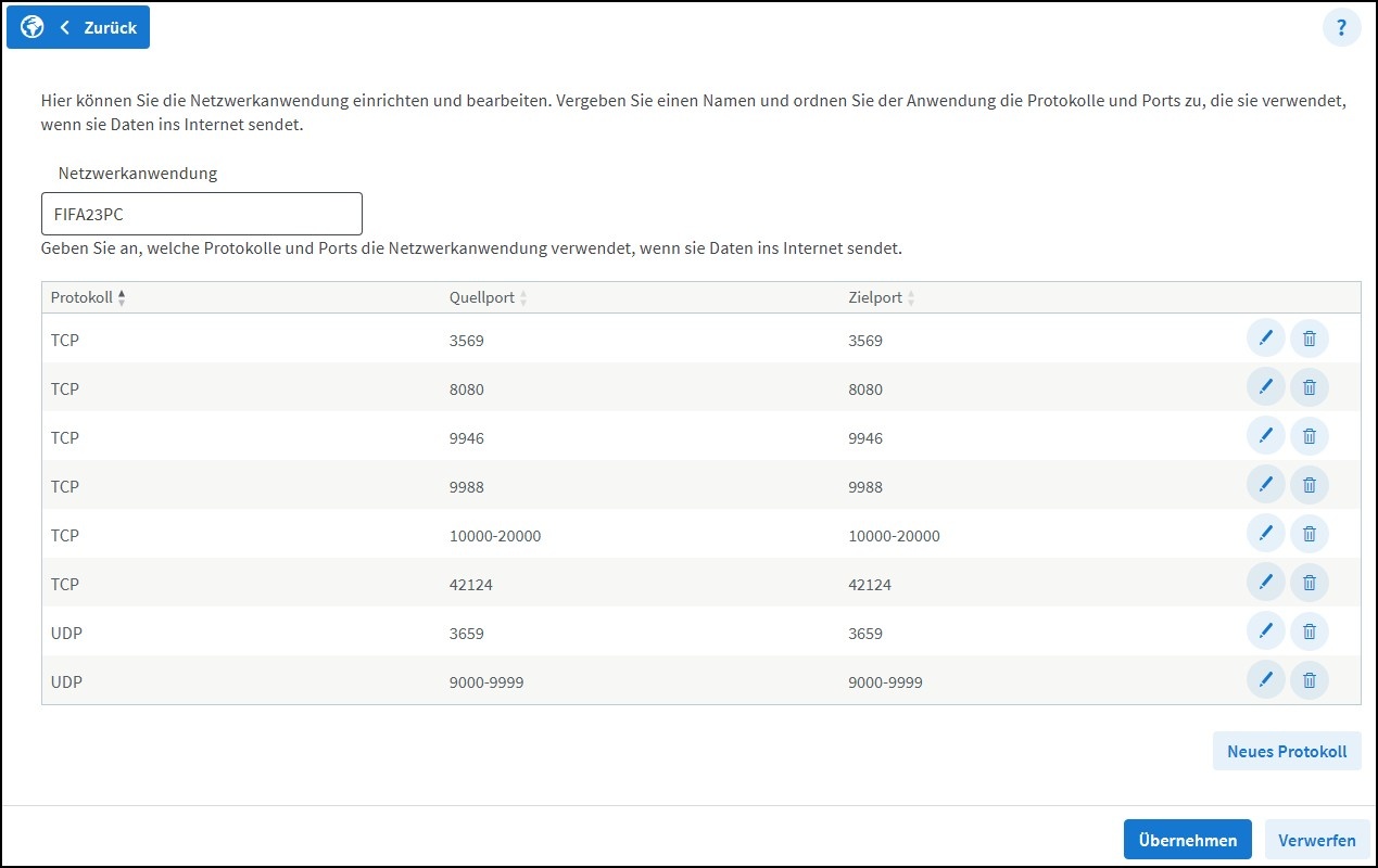 Um z.B. das Computerspiel FIFA 2023 (PC Version) in der FRITZ!Box als Netzwerkanwendung einzurichten, sind acht unterschiedliche Regeln erforderlich: